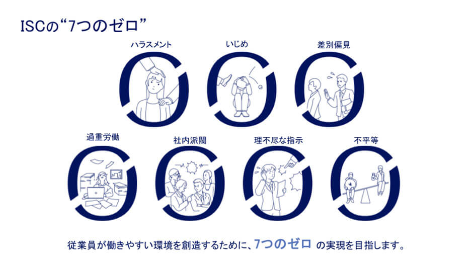 健康経営を推進する上で、メンタルヘルスの維持は非常に重要です。アイエスエフネットでは、「一緒に働きたいと思える人だけがいる会社にする」というISCの考え方をもとに、「人間関係の悩みゼロ」の会社を目指しています。