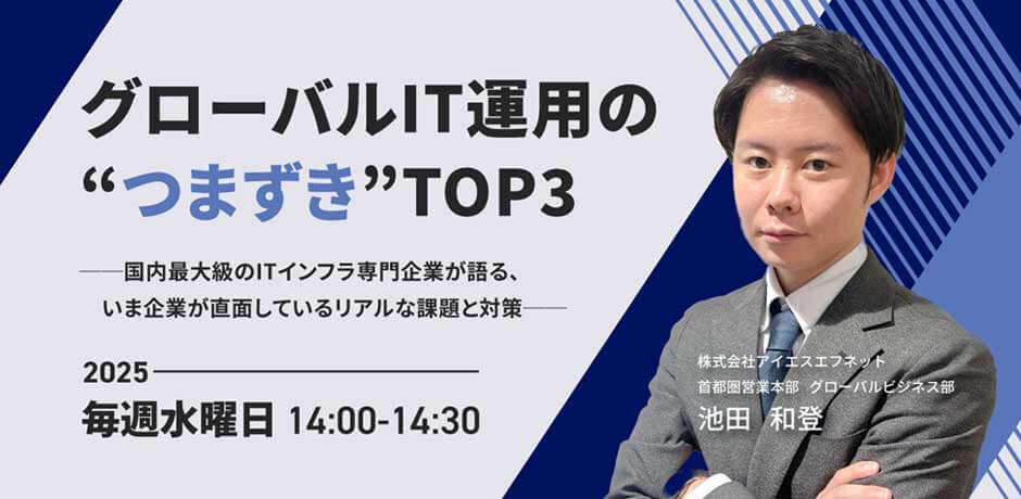 ITインフラソリューションを中心に、クラウド環境やネットワークシステムの構築・保守・運用に関するサービスを提供する株式会社アイエスエフネットは、2025年9月10日から毎週水曜日に、「グローバルIT運用の“つまずき”TOP3─国内最大級のITインフラ専門企業が語る、いま企業が直面しているリアルな課題と対策─」セミナーを開催いたします。
