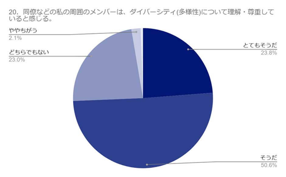 ダイバーシティに関する設問では、社内の多様性理解・尊重が着実に浸透していることがうかがえる結果となりました。- 「同僚などの私の周囲のメンバーは、ダイバーシティ(多様性)について理解・尊重していると感じる」:74.4%