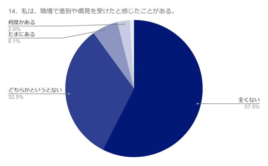 また、「私は、職場で差別や偏見を受けたと感じたことがある」という設問に対して、「そう感じたことはない」と回答した方が91.0%にのぼり、実際の差別や偏見が少ない職場環境であることも明らかになりました。