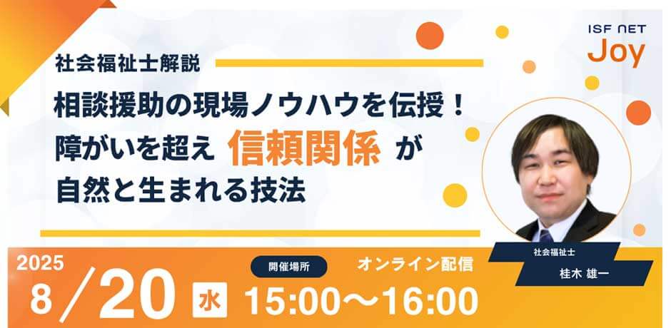 株式会社アイエスエフネットジョイ(本社:東京都新宿区、代表取締役:渡邉幸義、以下アイエスエフネットジョイ)は、2025年8月20日(水)の日程にて障がい者雇用セミナー「社会福祉士解説 相談援助の現場ノウハウを伝授!障がいを超え信頼関係が自然と生まれる技法」を開催いたします。