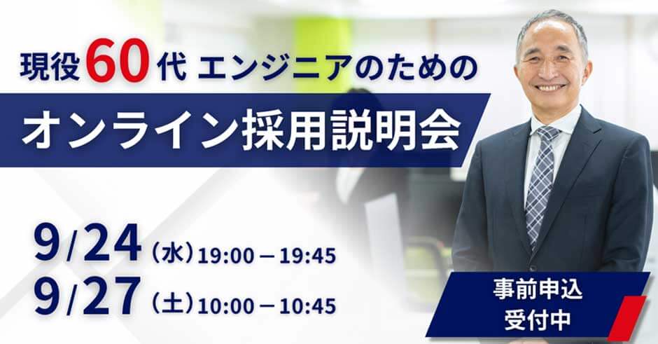 本説明会は、「生涯エンジニア」として活躍し続けたい方、ご自身の経験・知識を若手エンジニア育成や組織の成長に活かしたいとお考えの方を対象に実施いたします。定年後も安定した雇用形態で働きたいとお考えの方にとって、キャリアの選択肢を広げる機会となります。