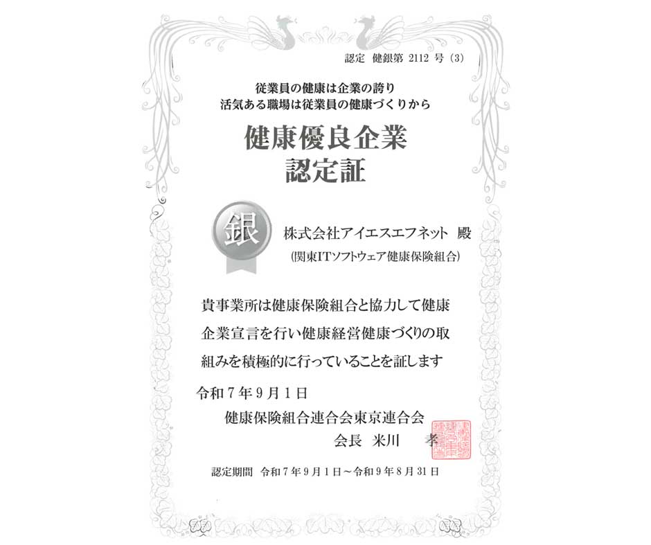 株式会社アイエスエフネット(本社:東京都港区/代表取締役:渡邉幸義、以下アイエスエフネット)は、健康保険組合連合会東京連合会による、健康優良企業「銀の認定」を取得いたしましたのでお知らせいたします。