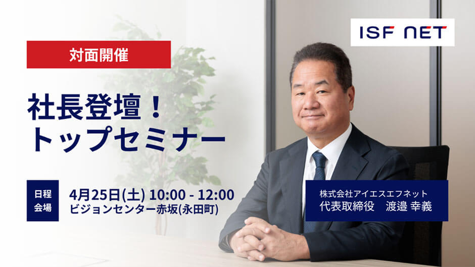 株式会社アイエスエフネット(本社:東京都港区/代表取締役:渡邉幸義、以下アイエスエフネット)は、2026年4月25日(土)にビジョンセンター赤坂(永田町)にて、27年卒向け「社長登壇!トップセミナー」を開催します。当日は代表の渡邉が登壇し、就職活動中の学生に、アイエスエフネットの魅力を直接お伝えします。